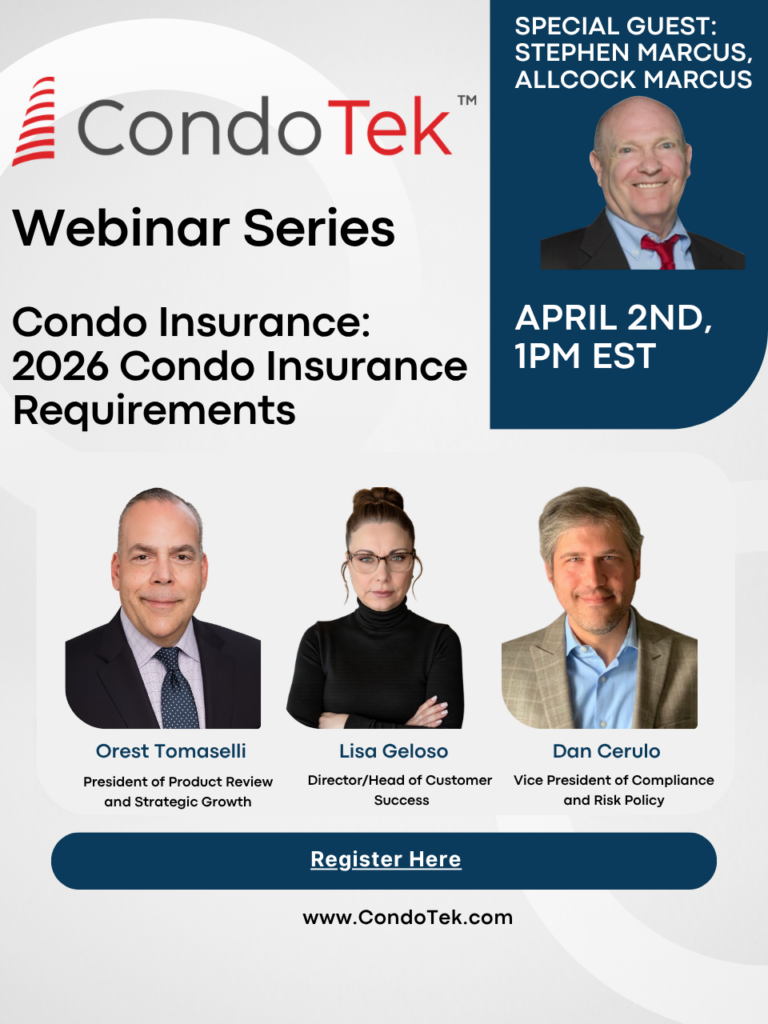 CondoTek recently hosted a webinar on 2026 condo insurance requirements, bringing together industry experts to discuss what associations need to know heading into the new year. If you missed the live session, you can now access the recording and presentation slides below.